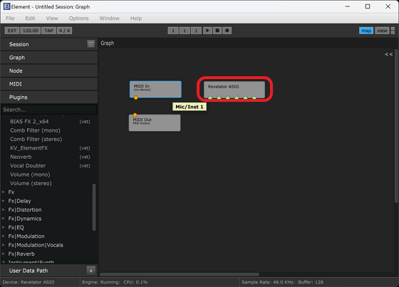 オーディオインターフェイスの入力用パーツが配置されます。ここでは「Revelator ASIO」という名前になっています。