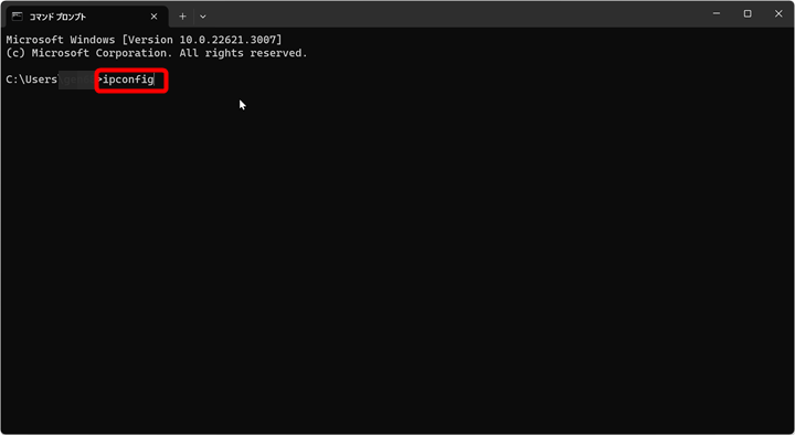 のように表示されているので、続けて”ipconfig"とタイプし、【Enter】キーを押すと次のような文字が画面に現れました。