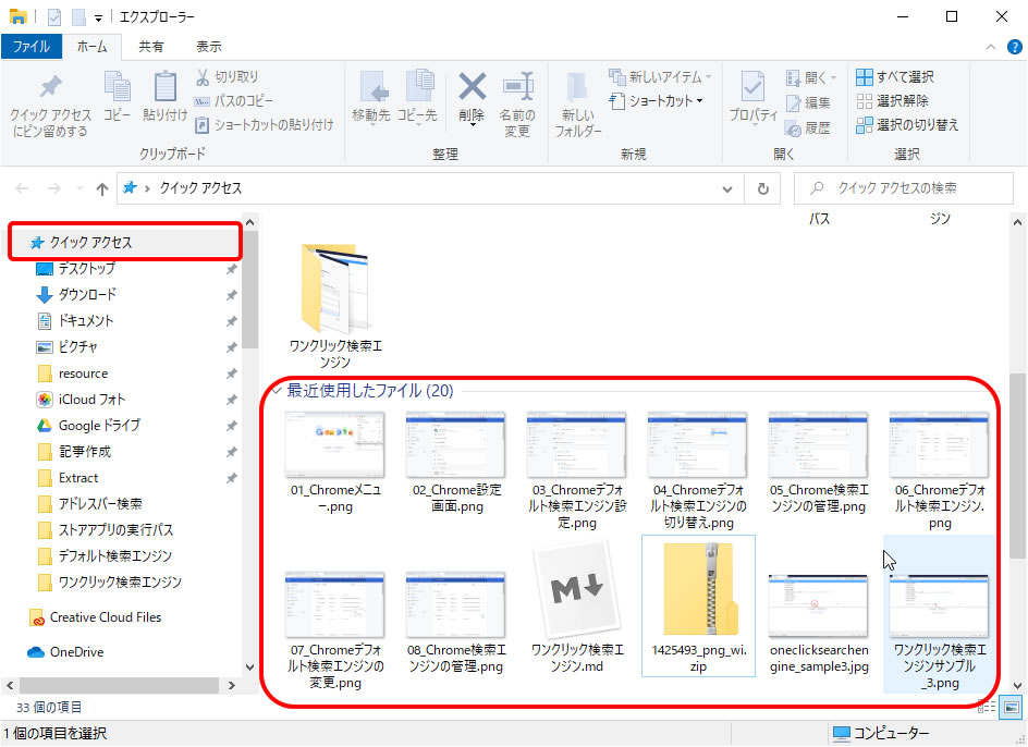 保存先フォルダの正確なパスを覚えていなくても、クイックアクセスからカンタンに見つけられるので便利ですよね。