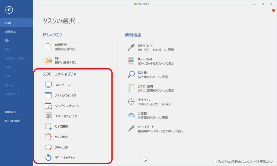 すると画像の新規作成やファイルの保存/オープンのほかに、キャプチャー用のコマンドが並んでいます。