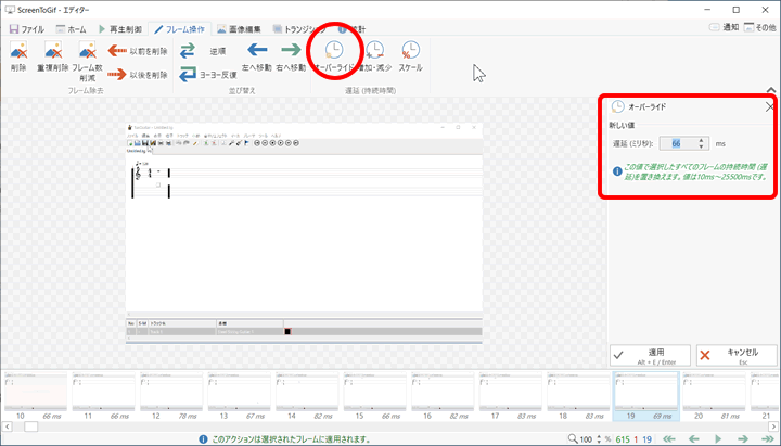 選択しているフレームのみに対して、持続時間(遅延時間)を書き換えます。