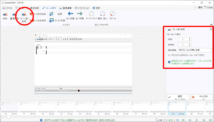 「フレーム操作」タブには、[フレーム数削減]というコマンドもあります。